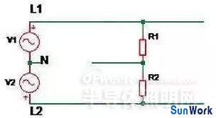 如上圖所示,V1 表示第一相電壓,V2表示第二相電壓,R1 及 R2 分別表示正常安裝到線路中的 LED 驅(qū)動器。當線路上零線(N)如圖斷開時,兩個支路上的驅(qū)動器 R1,R2 相當于串聯(lián)后接到 380Vac 電壓上。因為輸入內(nèi)阻差異,當其中一個驅(qū)動器充電到啟動時,內(nèi)阻變小,電壓可能大部分加到另外一個驅(qū)動器上,導致其過壓損壞失效。